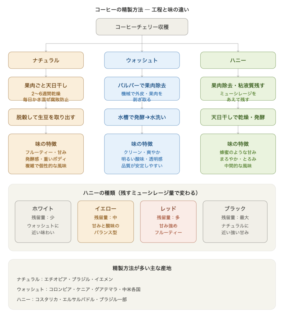 精製とは、この果実から生豆を取り出して乾燥させるまでの工程のことだ。どうやって果肉を取り除くか、どの段階で乾燥させるか——その方法の違いが「ナチュラル」「ウォッシュト」「ハニー」という名称になる。
