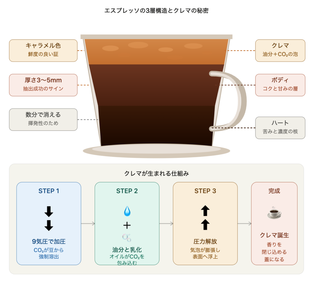 クレマ(上層):油分とCO₂の泡。香りの宝庫で、飲んだときの口当たりをまろやかにする。