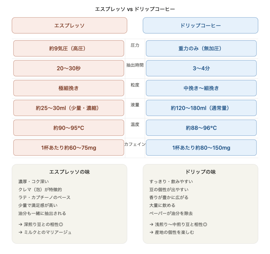 エスプレッソとドリップの違いは突き詰めれば「圧力」の有無に集約される。その圧力の差が、粒度・抽出時間・クレマ・味の濃度・カフェイン量まで、あらゆる違いを生み出している。