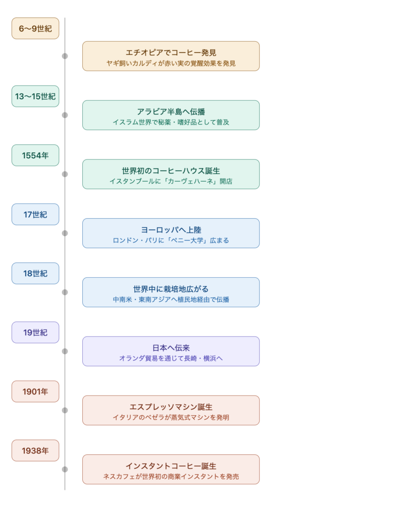 毎朝当たり前のように飲んでいるコーヒー。でもこの一杯が世界に広まるまでには、実に1000年以上の旅があった。今日はそのドラマチックな歴史を、時代を追いながらたどってみたい。