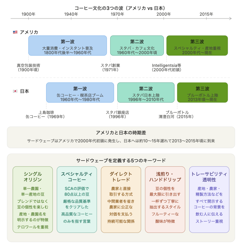 サードウェーブはコーヒー文化のトレンドや姿勢を表す言葉。品質だけでなく、体験・ストーリー・持続可能性への意識も含む。
